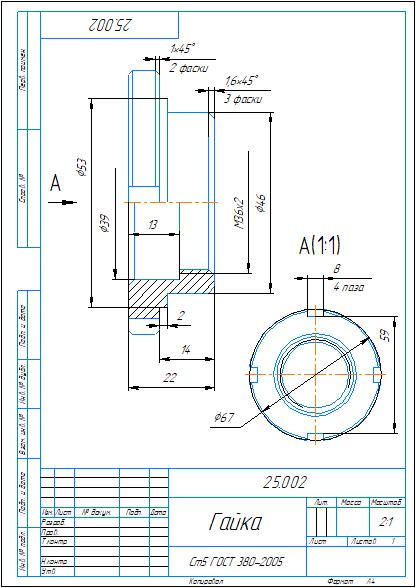Рабочий чертеж детали 25.002 гайка в программе Компас 3D из сборника по деталированию Аксарина