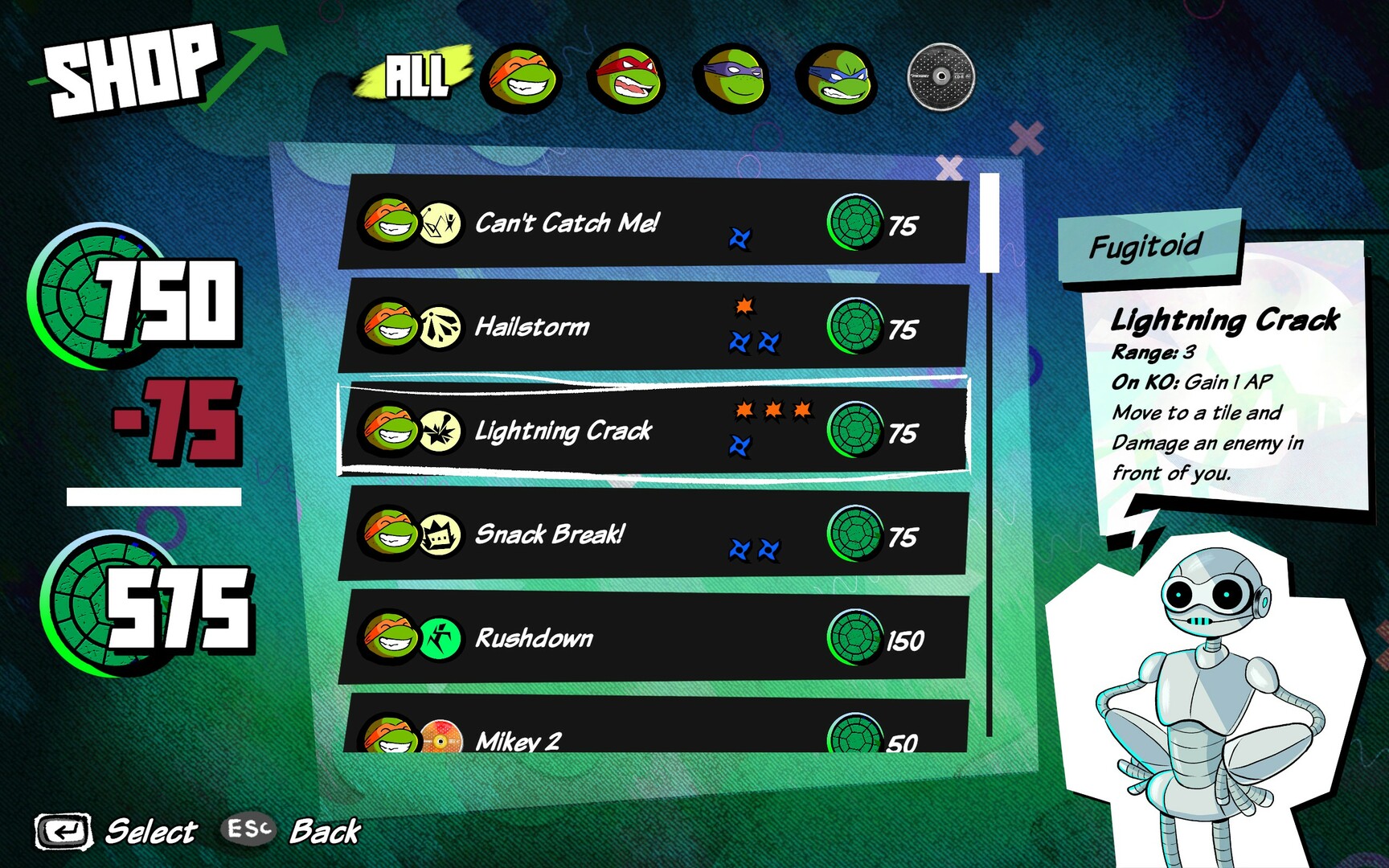 Сражайтесь с кланом Фут, где новый могущественный лидер берёт управление на себя в захватывающих кампаниях, которые демонстрируют индивидуальность каждой Черепашки. Сокрушайте врагов на 20 постоянно мутирующих уровнях, которые растут, уменьшаются и добавляют новые угрозы с каждым ходом, вдохновлённых классическими играми TMNT! Набирайте очки за рекорды, погружаясь в захватывающую оригинальную историю Черепашек-ниндзя от известной инди-студии Strange Scaffold. Это следующий шаг для Микеланджело, Донателло, Леонардо и Рафаэля, и вы можете испытать его с помощью летающих, рубящих фигурок в великолепии графических романов. ================================== ✅ 🎮 НЕ НАШЛИ ИНТЕРЕСУЮЩУЮ ИГРУ / DLC В ПОИСКЕ?