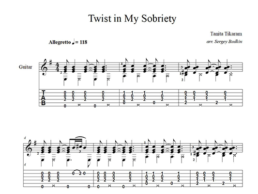 Аранжировка для гитары песни Twist in My Sobriety, хита певицы Таниты Тикарам. Для звучания в оригинальной тональности f-moll используйте каподастр на I ладу.