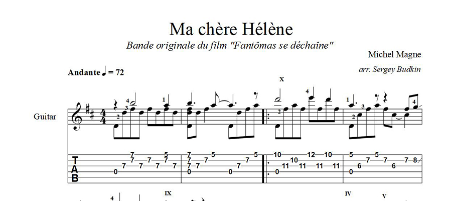 Аранжировка для гитары мелодии французского композитора Мишеля Маня Ma Chere Helene из кинофильма "Фантомас".