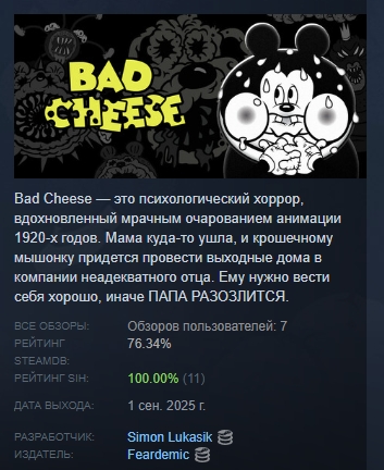 Bad Cheese — это психологический хоррор, вдохновленный мрачным очарованием анимации 1920-х годов. Мама куда-то ушла, и крошечному мышонку придется провести выходные дома в компании неадекватного отца. Ему нужно вести себя хорошо, иначе ПАПА РАЗОЗЛИТСЯ.