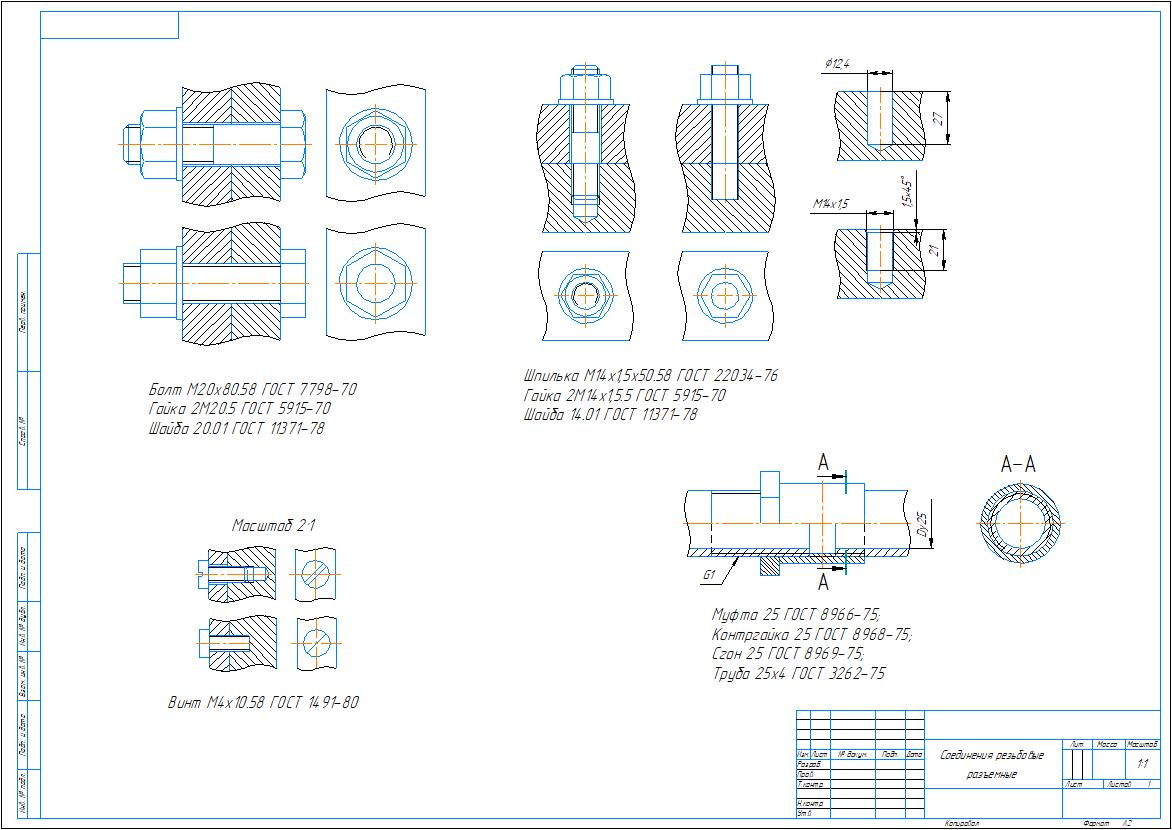 Чертеж болтового соединения М20, шпилечного соединения М14х1,5, винтового соединения М4, трубного соединения G1 в программе Компас 3D