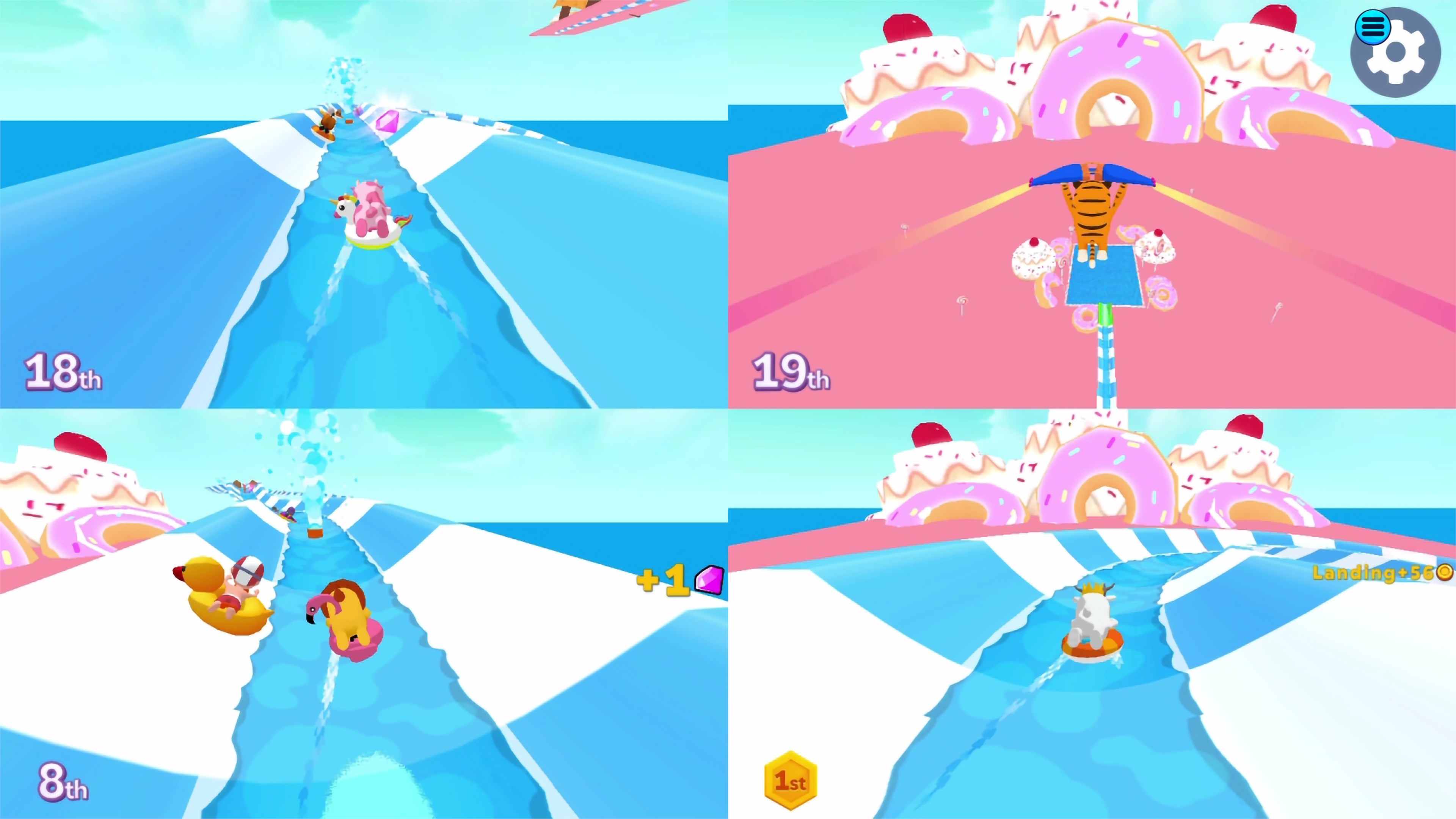 Скатись по огромной водной горке, спиралью спускающейся с небес, обгони друзей, столкни их с трассы или используй усиления, чтобы получить преимущество. Самое забавное — можно в любой момент спрыгнуть с трассы и приземлиться на нижний уровень, мгновенно обогнав всех!