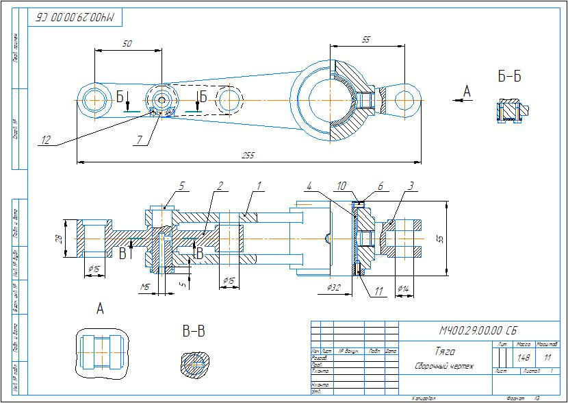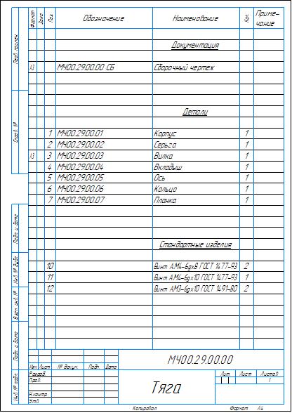 Сборочный чертеж, спецификация, 3д-модели деталей и сборки МЧ00.29.00.000 тяга из альбома по деталированию Боголюбова. Чертежи и модели выполнены в компасе