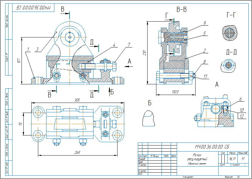 Сборочный чертеж, спецификация, 3D модели деталей и сборки ролика регулируемого МЧ00.36.00.00 из альбома по деталированию Боголюбова. Чертеж и модели выполнены в программе Компас 3D.