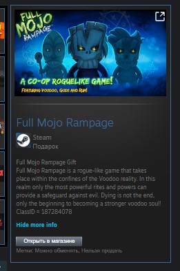Full Mojo Rampage — это игра в жанре rogue-like, действие которой разворачивается в мире вуду. В этом мире только самые могущественные обряды и силы могут защитить от зла. Смерть — это не конец, а лишь начало пути к становлению более сильной души вуду!