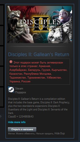 Disciples II: Gallean´s Return — это сборник, включающий базовую игру Disciples II: Dark Prophecy, а также два отдельных дополнения Disciples II: Guardians of the Light и Disciples II: Servants of the Dark.