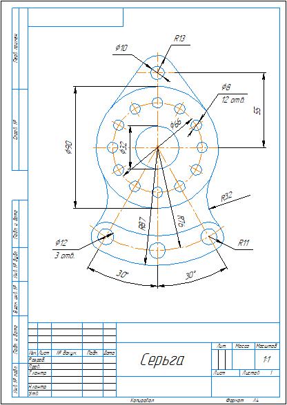 Чертеж детали серьга по теме сопряжения в программе Компас 3D