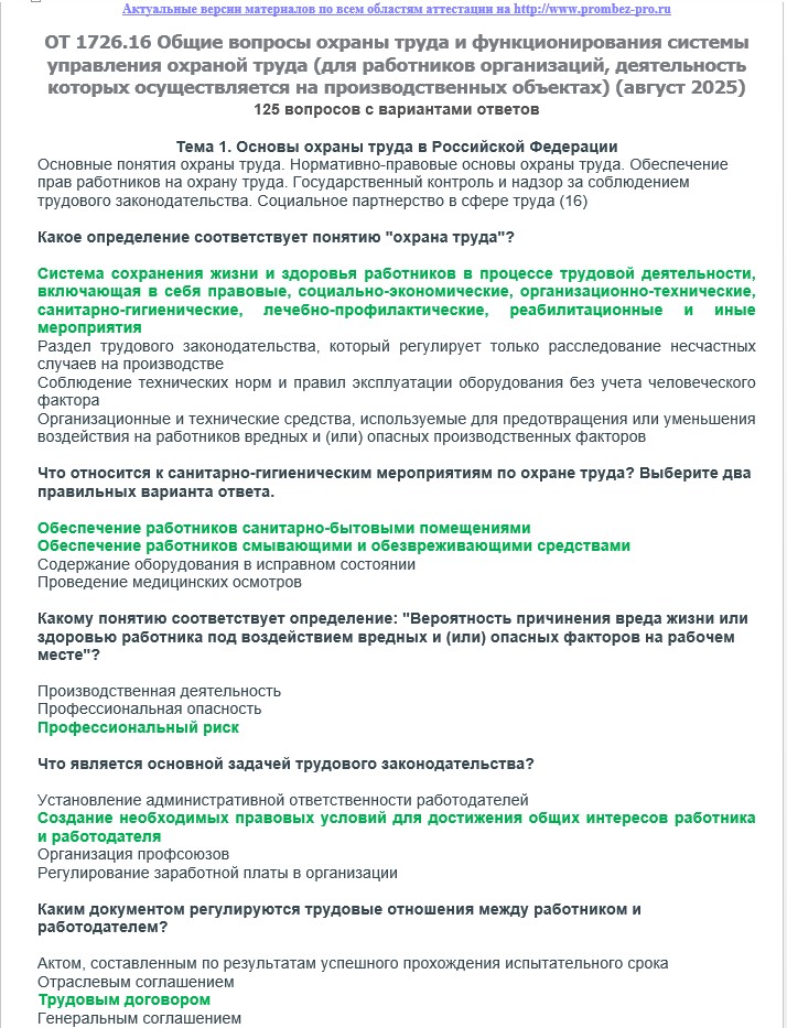 Вопросы с ответами к курсам ОКС-Олимп ОТ 1726.16 (август 2025) Общие вопросы охраны труда и функционирования системы управления охраной труда (для работников организаций, деятельность которых осуществляется на производственных объектах)