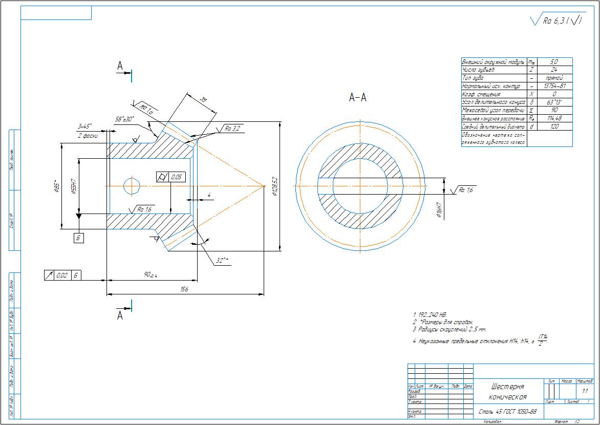 Рабочий чертеж детали шестерня коническая с параметрами зубчатого венца: модуль m=5 мм, число зубьев z=24 шт. Чертеж выполнен в программе Компас 3D.