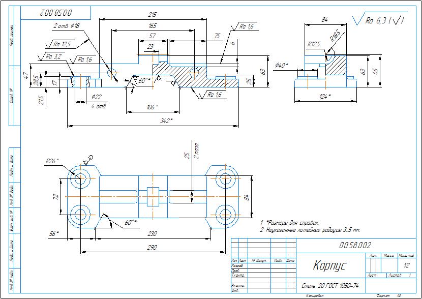 Рабочий чертеж детали корпус 00.58.002 из сборки "Ролик поддерживающий". Чертеж выполнен в программе Компас 3D