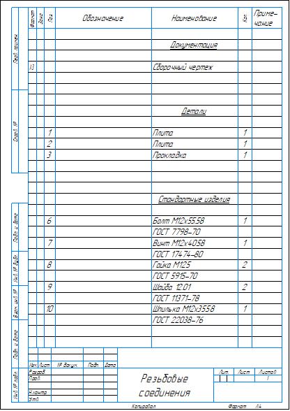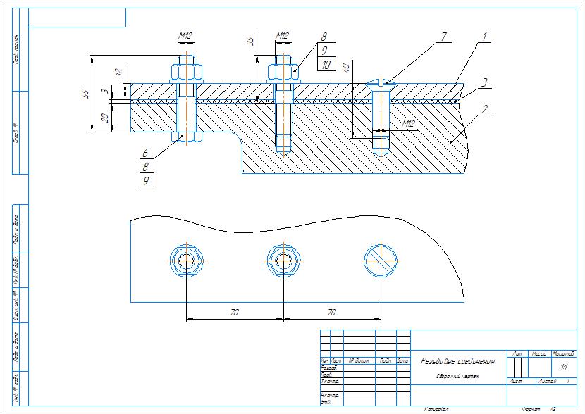 Чертеж и спецификация соединения болтом М12, соединение шпилькой М12, соединения винтом М12 в конструктивном и упрощенном виде. Чертежи выполнены в программе Компас 3D