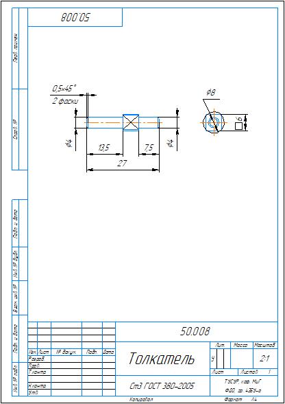 Рабочий чертеж детали толкатель 50.008 из сборки 50.000 пневмоклапан давления из альбома по деталированию Аксарина. Чертеж выполнен в программе компас