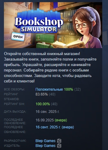 Откройте собственный книжный магазин! Заказывайте книги, заполняйте полки и получайте прибыль. Украшайте, расширяйте и нанимайте персонал. Собирайте редкие книги с особыми способностями. Заводите кота, чтобы радовать себя и клиентов!