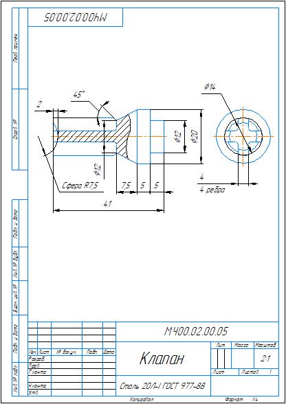 Рабочий чертеж детали клапан МЧ00.02.00.05 из сборки МЧ00.02.00.00 выключатель подачи топлива из сборника по деталированию Боголюбова. Чертеж выполнен в программе Компас 3D