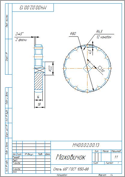 Рабочий чертеж детали маховичок МЧ00.02.00.13 из сборки МЧ00.02.00.00 из альбома по деталированию Боголюбова. Чертеж выполнен в программе Компас 3D