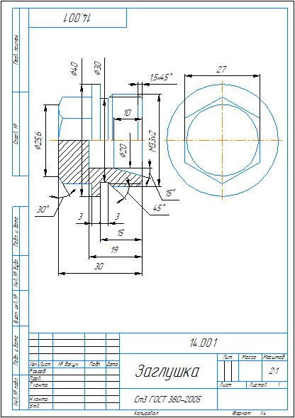 Рабочий чертеж и 3D модель детали заглушка 14.001 из сборки 14.000 пневмораспределитель из альбома по деталированию Аксарина. Модель и чертеж выполнены в компас