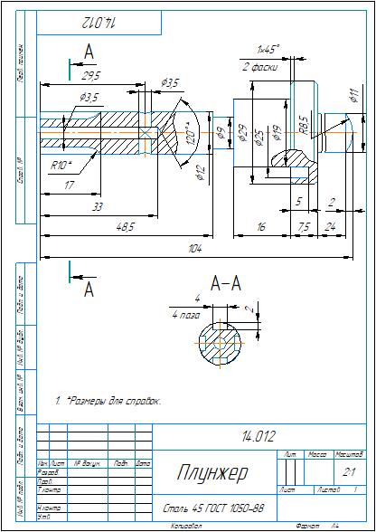 Рабочий чертеж и 3D модель детали плунжер 14.012 из сборки 14.000 пневмораспределитель из альбома по деталированию Аксарина. Чертеж и модель выполнены в программе Компас 3D