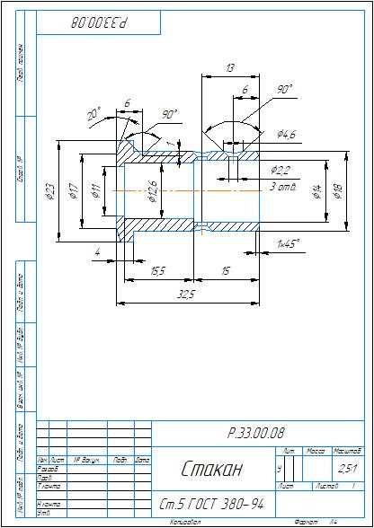 Рабочий чертеж детали стакан Р.33.00.08 из сборки Р.33.00.00 ручка. Чертеж выполнен в программе Компас 3D