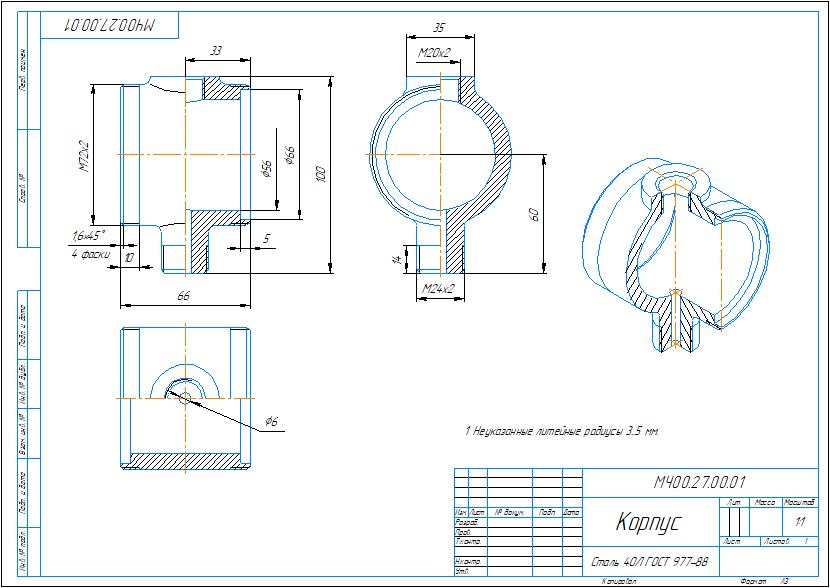 Рабочий чертеж детали и 3D модель детали корпус МЧ00.27.00.01 из сборки МЧ00.27.00.00 маслоуказатель альбома по деталированию Боголюбова. Модель и чертеж выполнены в программе Компас 3D