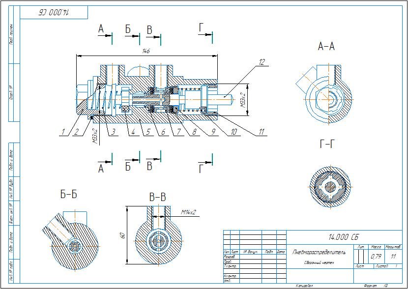 Сборочный чертеж, спецификация, 3D модель сборки 14.000 пневмораспределитель из альбома по деталированию Аксарина.