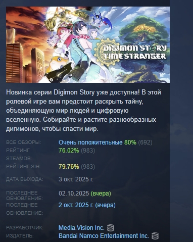 Digimon Story Time Stranger — ролевая игра с приручением монстров, в которой разворачивается грандиозная история, раскрывающая тайну гибели мира, и уделяется внимание глубоким узам между людьми и дигимонами.