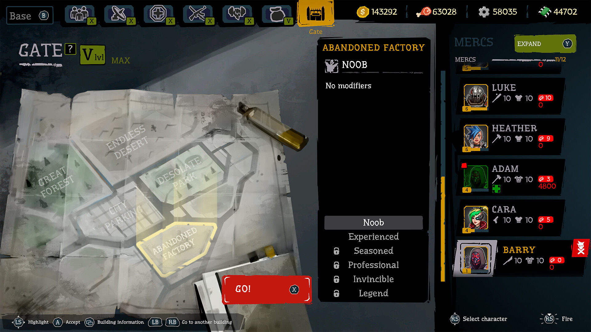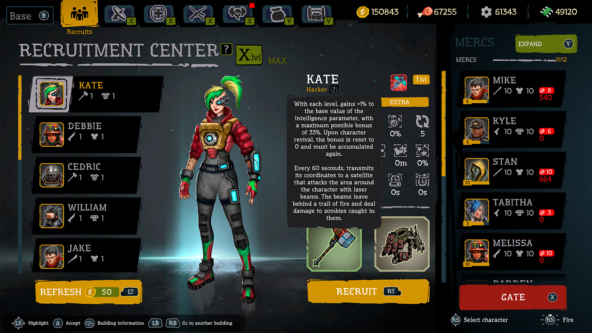 Развивай базу выживших, чтобы получить улучшения. Прокачивай наемников в тренировочном центре, нанимай новых головорезов в здании рекрутов, а также модифицируй оружие и броню в мастерской. Улучшенные строения увеличивают шансы на спасение.
