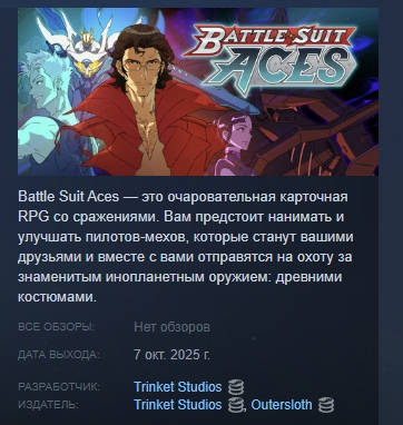 Battle Suit Aces — это очаровательная карточная RPG со сражениями. Вам предстоит нанимать и улучшать пилотов-мехов, которые станут вашими друзьями и вместе с вами отправятся на охоту за знаменитым инопланетным оружием: древними костюмами.