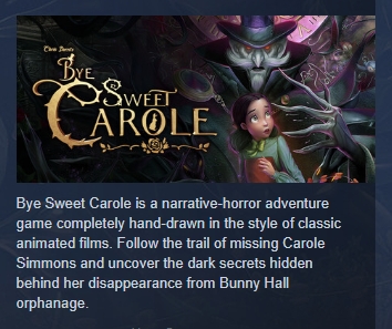 Bye Sweet Carole — это рисованная хоррор-адвенчура от разработчиков Little Sewing Machine, вдохновленная классическими анимационными фильмами, но с мрачной атмосферой. Игра рассказывает о юной Лане Бентон, которая расследует исчезновение подруги в жутком приюте «Банни Холл», где ей предстоит столкнуться с ужасным «Мистером Кином», совой Веление и кроликами.