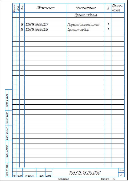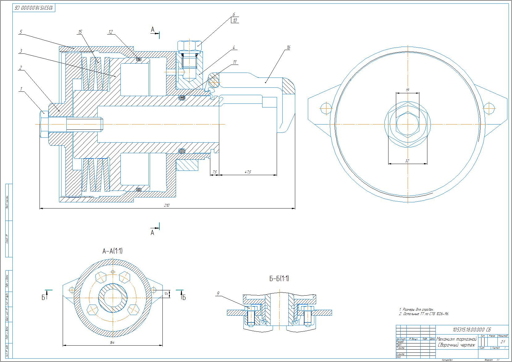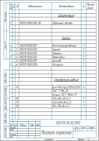 Сборочный чертеж и спецификация механизма тормозного автомобиля ВАЗ. Чертеж и спецификация выполнены в программе Компас
