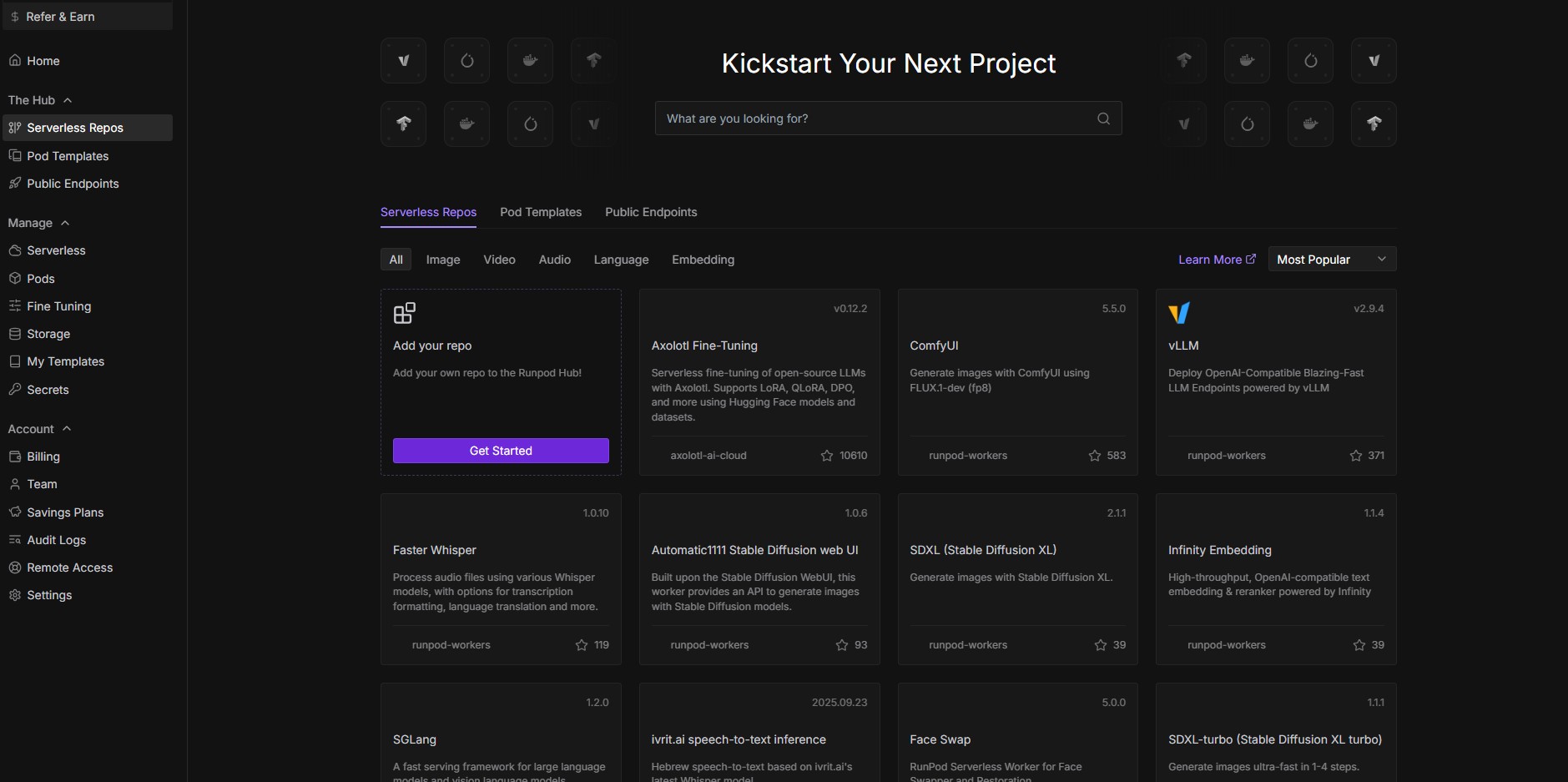 Console.runpod — это веб-интерфейс консоли платформы RunPod. Он позволяет управлять экземплярами GPU (подами), конечными точками, получать доступ к терминалам подам, отправлять запросы конечным точкам, контролировать использование ресурсов и просматривать историю платежей и использования.