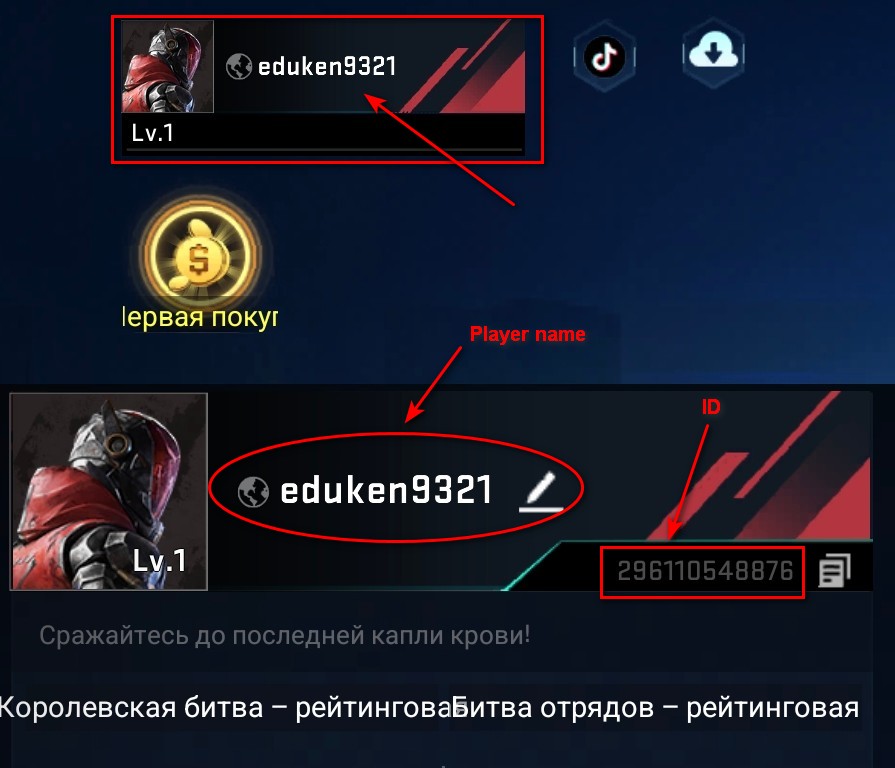 ⬆️Посмотрите на скриншот, запустите игру, нажмите на изображение профиля в левом верхнем углу. В меню «На главную» с права будет аватар, имя игрока и ID, а с права кнопка для его копирования. Например: