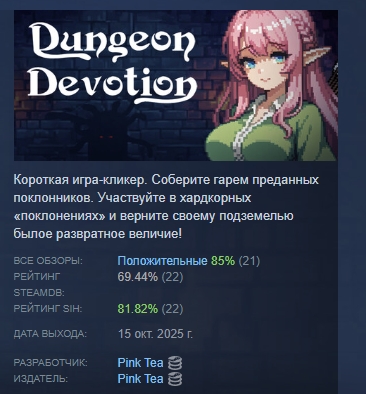 Короткая игра-кликер. Соберите гарем преданных поклонников. Участвуйте в хардкорных «поклонениях» и верните своему подземелью былое развратное величие!
