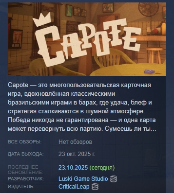 Capote — это многопользовательская карточная игра, вдохновлённая классическими бразильскими играми в барах, где удача, блеф и стратегия сталкиваются в шумной атмосфере. Победа никогда не гарантирована — и одна карта может перевернуть всю партию. Сумеешь ли ты выполнить свою ставку или сгоришь дотла?