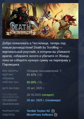Добро пожаловать в Чистилище, теперь под новым руководством! Death by Scrolling — вертикальный роуглайк, в котором вы убиваете врагов, собираете золото и убегаете от Жнеца, пока не соберёте нужную сумму на переправу у Паромщика.