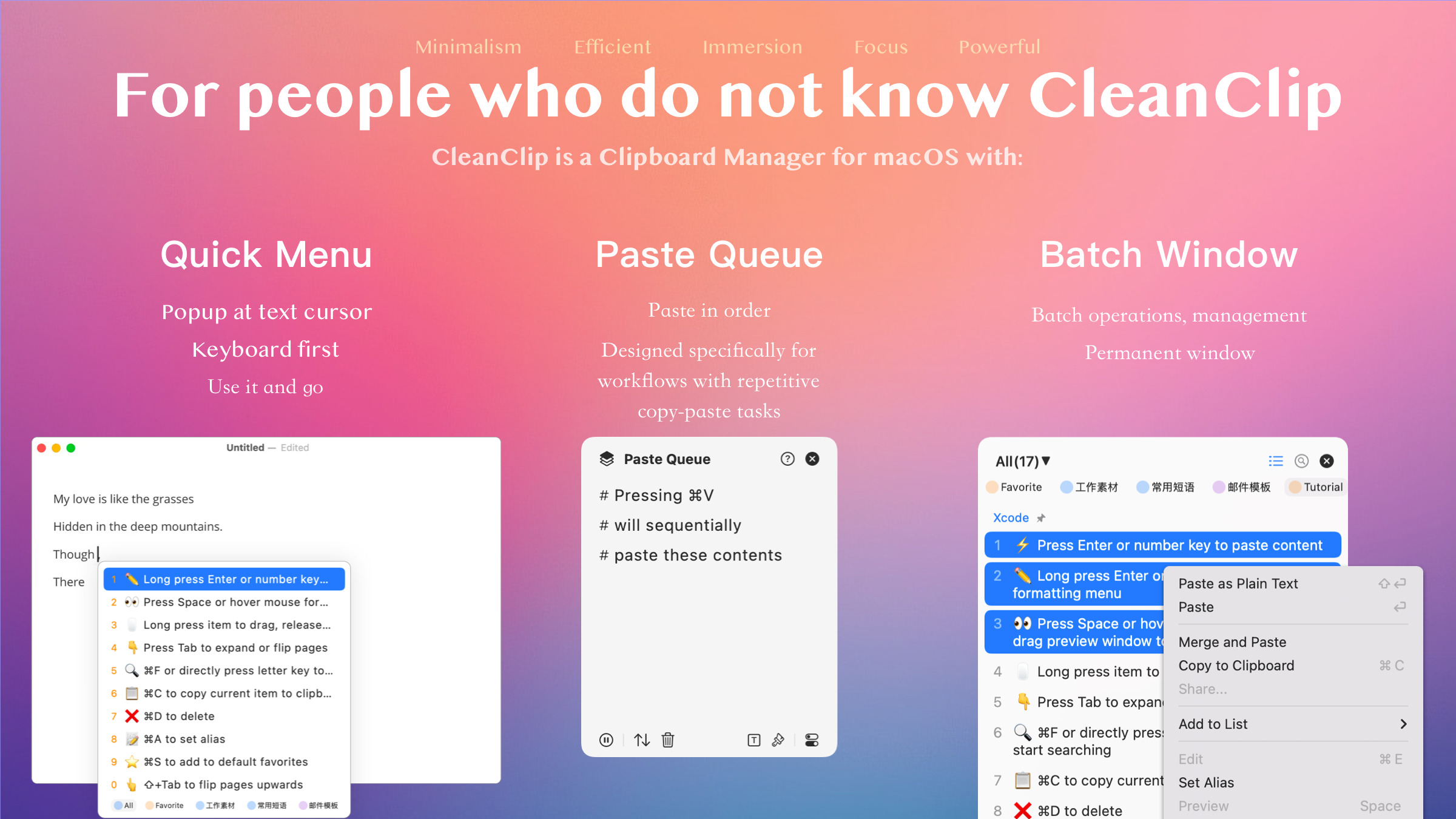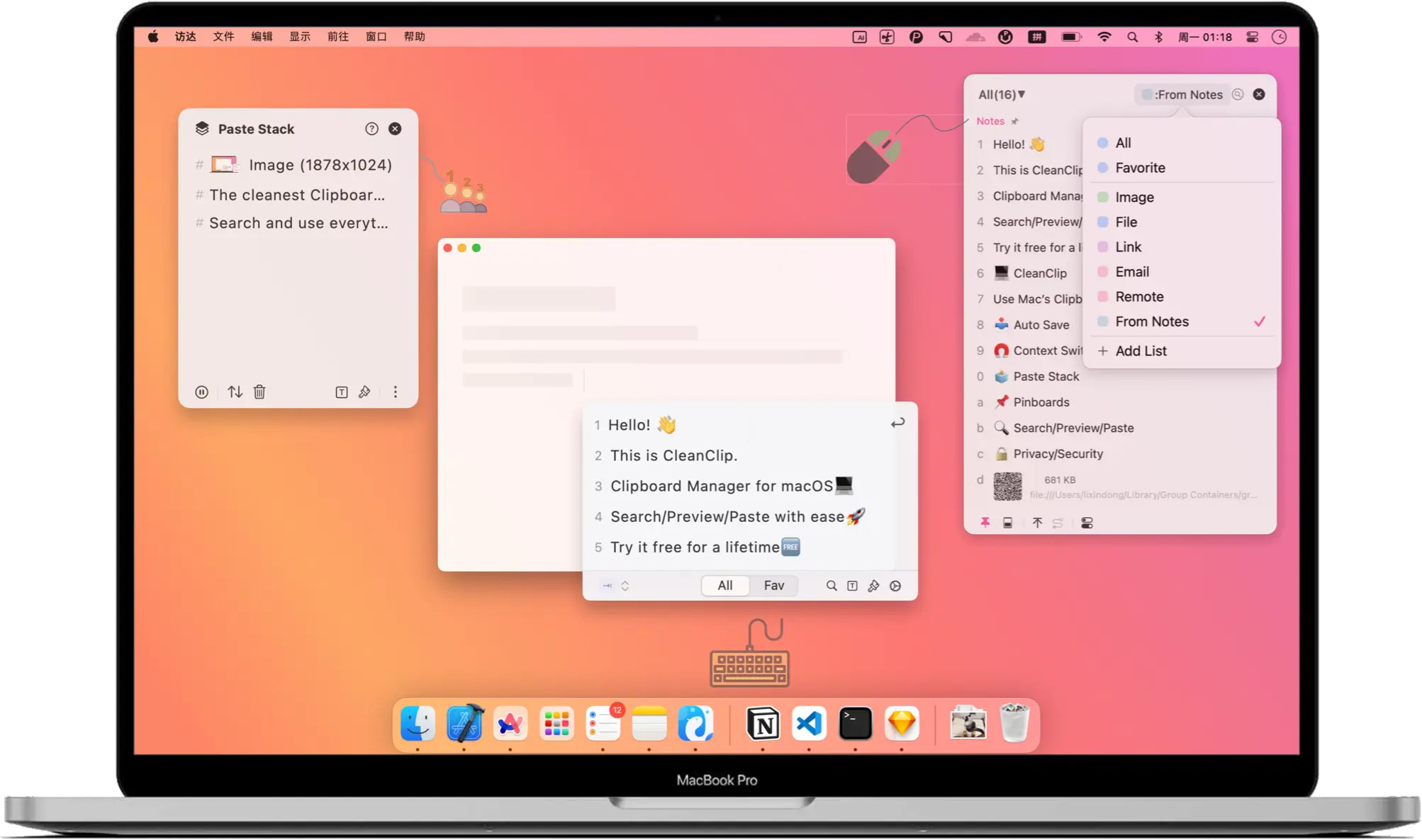 CleanClip - это самый чистый и мощный менеджер буфера обмена для macOS, разработанный для трансформации вашего рабочего процесса копирования-вставки. Он автоматически сохраняет все скопированное содержимое - текст, изображения, файлы и многое другое - позволяя вам получить доступ к полной истории буфера обмена за секунды, не теряя важную информацию.