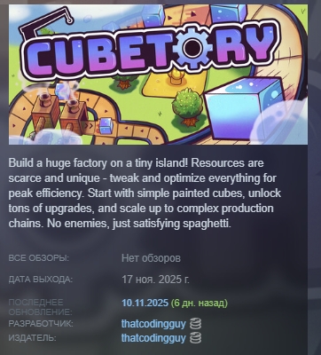 Всё, что вы производите в Cubetory, — это куб, и все кубы попадают в яму . На ранних этапах игры это означает добычу кубов и их покраску в определённый узор. Сложность быстро возрастает благодаря цепочкам сборки, побочным продуктам, недетерминированным процессам и многому другому.