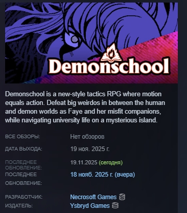 Demonschool — это тактическая ролевая игра нового формата, где движение равносильно действию. Играя за Фэй и её товарищей-неудачников, побеждайте крупных чудаков, обитающих между мирами людей и демонов, и пытайтесь влиться в университетскую жизнь на таинственном острове.