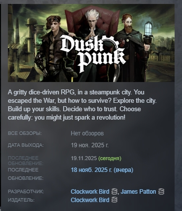 Суровая ролевая игра с кубиками в стимпанковском городе. Вы сбежали от Войны, но как выжить? Исследуйте город. Развивайте свои навыки. Решайте, кому доверять. Выбирайте обдуманно: возможно, именно вы спровоцируете революцию!