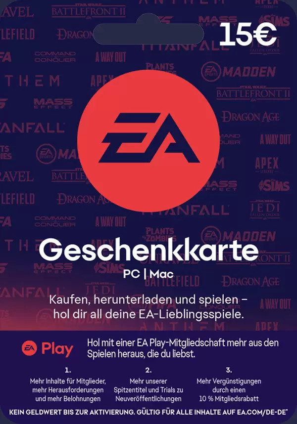 После оплаты данного товара вы получите лицензионный ключ от "EA Gift Card €15 (Ea App/EU)" для активации в системе "Ea App". Ключ отобразится на странице вашего браузера после оплаты.
