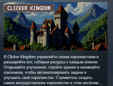 В Clicker Kingdom управляйте своим королевством и расширяйте его, собирая ресурсы с каждым кликом. Открывайте улучшения, стройте здания и нанимайте союзников, чтобы автоматизировать задачи и улучшить своё королевство. Стремитесь создать самое могущественное королевство в этом весёлом и увлекательном приключении!