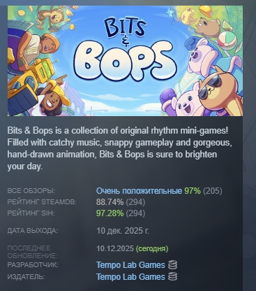 Bits & Bops — это сборник оригинальных ритм-мини-игр! Наполненный запоминающейся музыкой, динамичным геймплеем и великолепной, нарисованной вручную анимацией, Bits & Bops обязательно поднимет вам настроение.