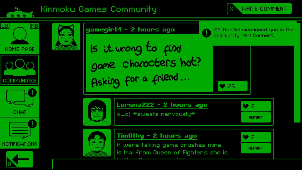 Погрузитесь в атмосферу прошлых социальных игровых сетей в VIDEOVERSE — повествовательном приключении с элементами принятия решений, где внимание уделяется развитию персонажей, дружбе и любви.