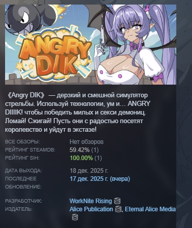 《Angry DIK》 — дерзкий и смешной симулятор стрельбы. Используй технологии, ум и… ANGRY DIIIIK! чтобы победить милых и секси демониц. Ломай! Сжигай! Пусть они с радостью посетят королевство и уйдут в экстазе!