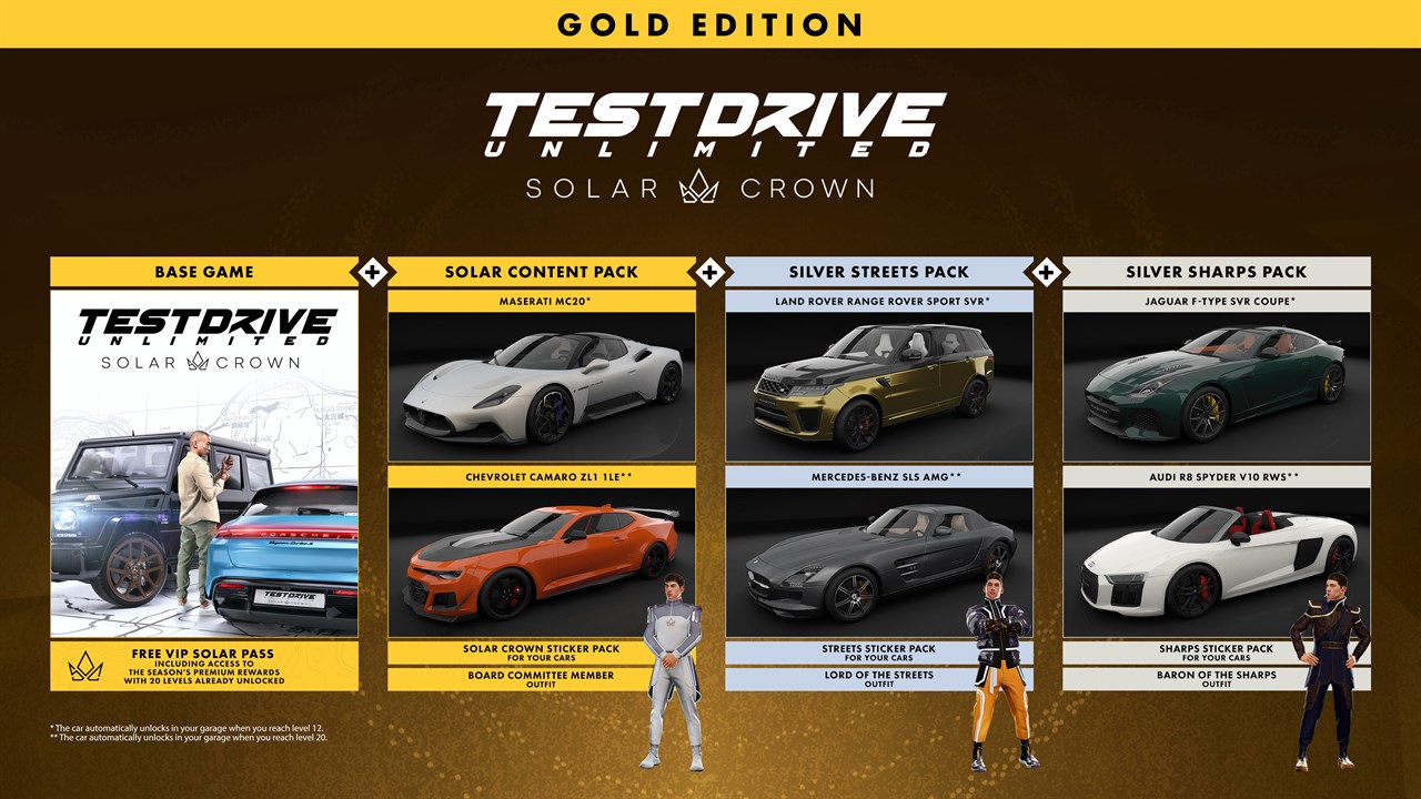 Test Drive Unlimited Solar Crown: Gold Edition открывает доступ ко всему контенту изданий Sharps Silver Edition и Streets Silver Edition, а также содержит следующие бонусы: