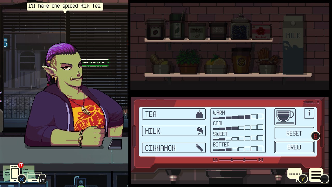 Meet quirky and interesting characters, such as; Baileys the elf freelance graphic designer, Lua, the succubus bisdev executive, Myrtle the orc game developer, and more. Listen to their stories and influence them with a warm drink or two!