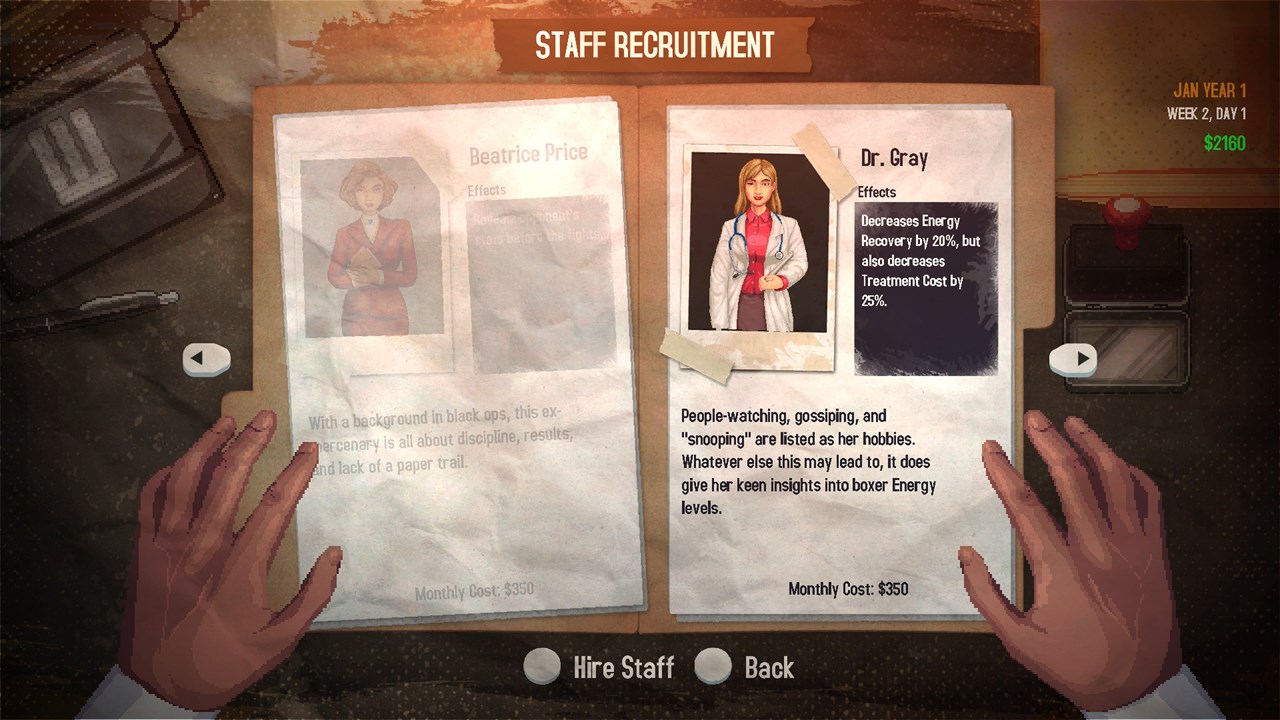 Нанимайте лучших бойцов и персонал, чтобы получить всеобщее обожание и одобрение. Наблюдайте, как ваши бойцы побеждают на ринге или же... отправляются в нокаут.