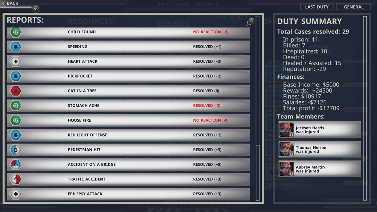 Отряды полиции, пожарных и медиков находятся в полном вашем распоряжении. Каждый отряд может использовать одно из множества транспортных средств (от стандартных автомобилей до вертолётов), снаряжение (бронежилеты, аптечки, ящики с инструментами), а также состоять из членов команды с различными навыками.