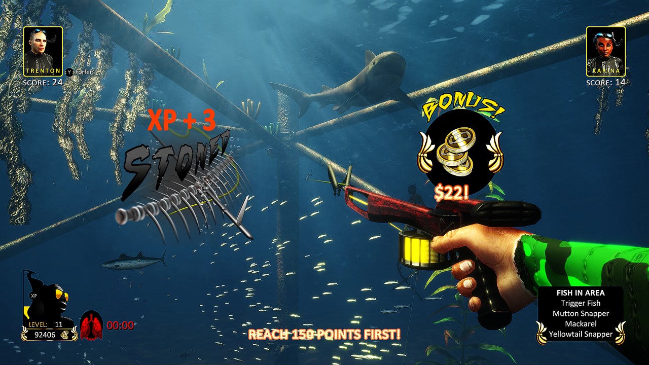 In this game, the player will choose their player character (male or female of various races/ethnicities) to compete against increasingly difficult spearfishing challengers from around the world with the goal of becoming the champion Freediving Hunter over all. On the way to becoming the champion the player will unlock lush saltwater marine environments around the world such as stunning reefs teeming with sea life, ancient shipwrecks and ruins, kelp forests, etc. in an exciting hunt for prized saltwater fish. The player will earn money with every fish they hunt, every challenger they defeat and every special shot they pull off, giving them the ability to buy new masks, fins, guns, wetsuits and flashlights to gain more advantage over their opponents and their prey. As the player conquers the depths, the fish will become bigger and more exotic. Of course, the player will also be warding off hungry sharks that are trying to steal their fish at all times while also avoiding the ever-present blackout danger, creating a very challenging, thrilling and suspenseful gameplay.