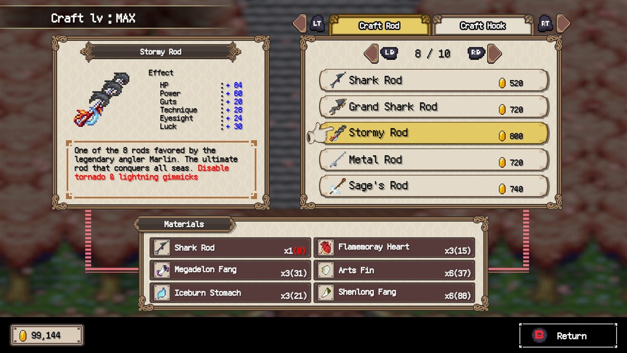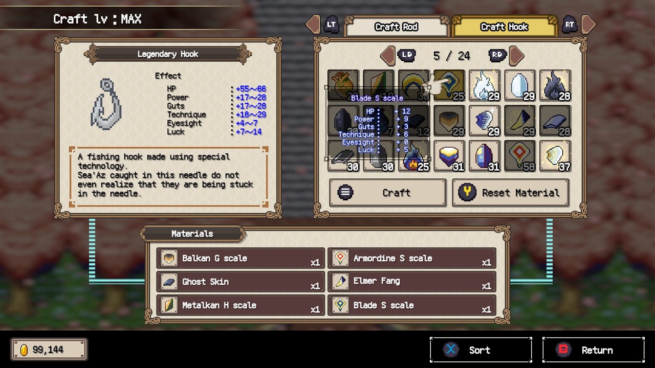 You can create equipment (fishing rods and hooks) using materials obtained from the Sea´Az you catch.